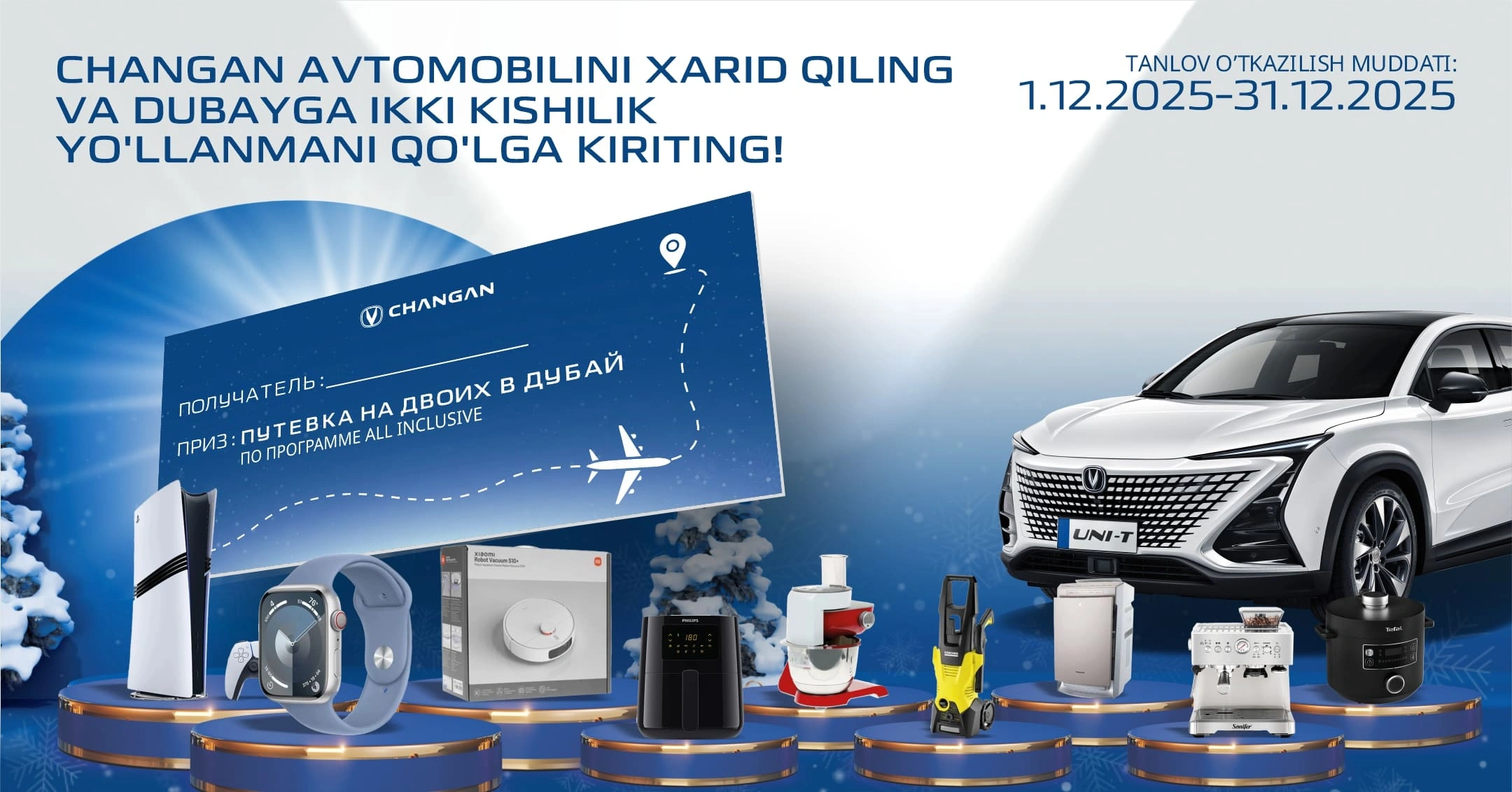 “CHANGAN AUTO DISTRIBUTION” МЧЖ компанияси Changan автомобилларининг барча харидорлари учун кенг кўламли янги йил акциясини бошламоқда. 1 декабрдан 31 декабргача бўлган даврда расмий дилерлардан янги автомобил харид қилган ҳар бир мижоз автоматик тарзда акция иштирокчисига айланади ва ўнта қимматбаҳо совғадан бирини ютиб олиш имкониятига эга бўлади.